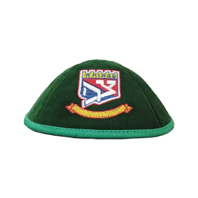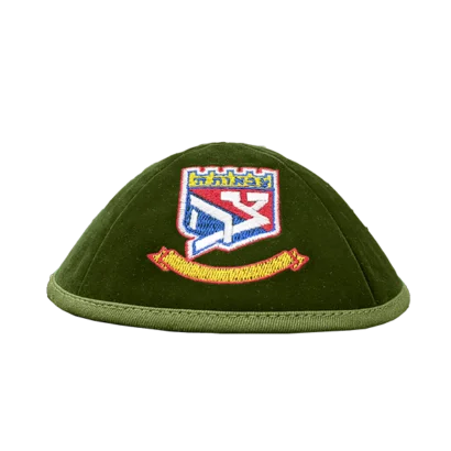 Kippa verte en velours, brodée avec le logo de Tsivot Hachem