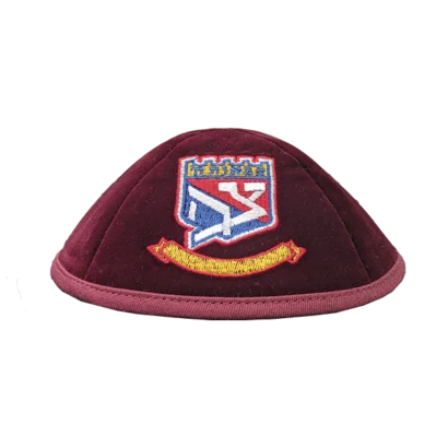 Kippa bordeau nuit en velours, brodée avec le logo de Tsivot Hachem