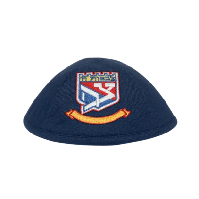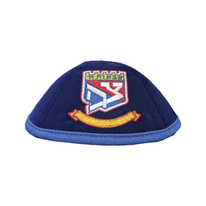 Kippa bleue nuit en velours, brodée avec le logo de Tsivot Hachem
